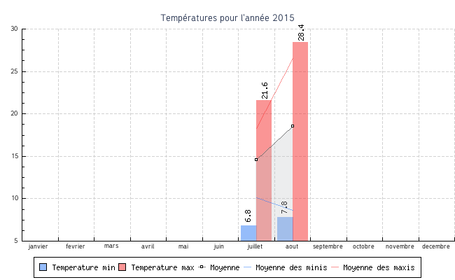 | juillet | 6.8 °C | 10.1 °C | 21.6 °C | 18.3 °C | 14.6 °C | 1.3 km/h | 9.6 km/h | S |